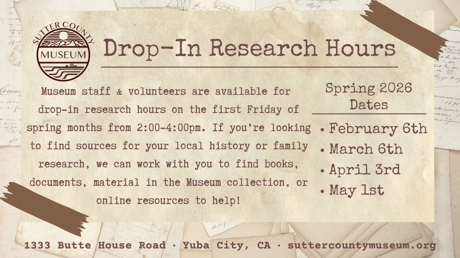 Museum staff and volunteers are available for drop-in research hours on the first Fridays of spring months. If you’re looking to find sources for your local history or family research, we can work with you to find books, documents, material in the Museum collection, or online resources to help!