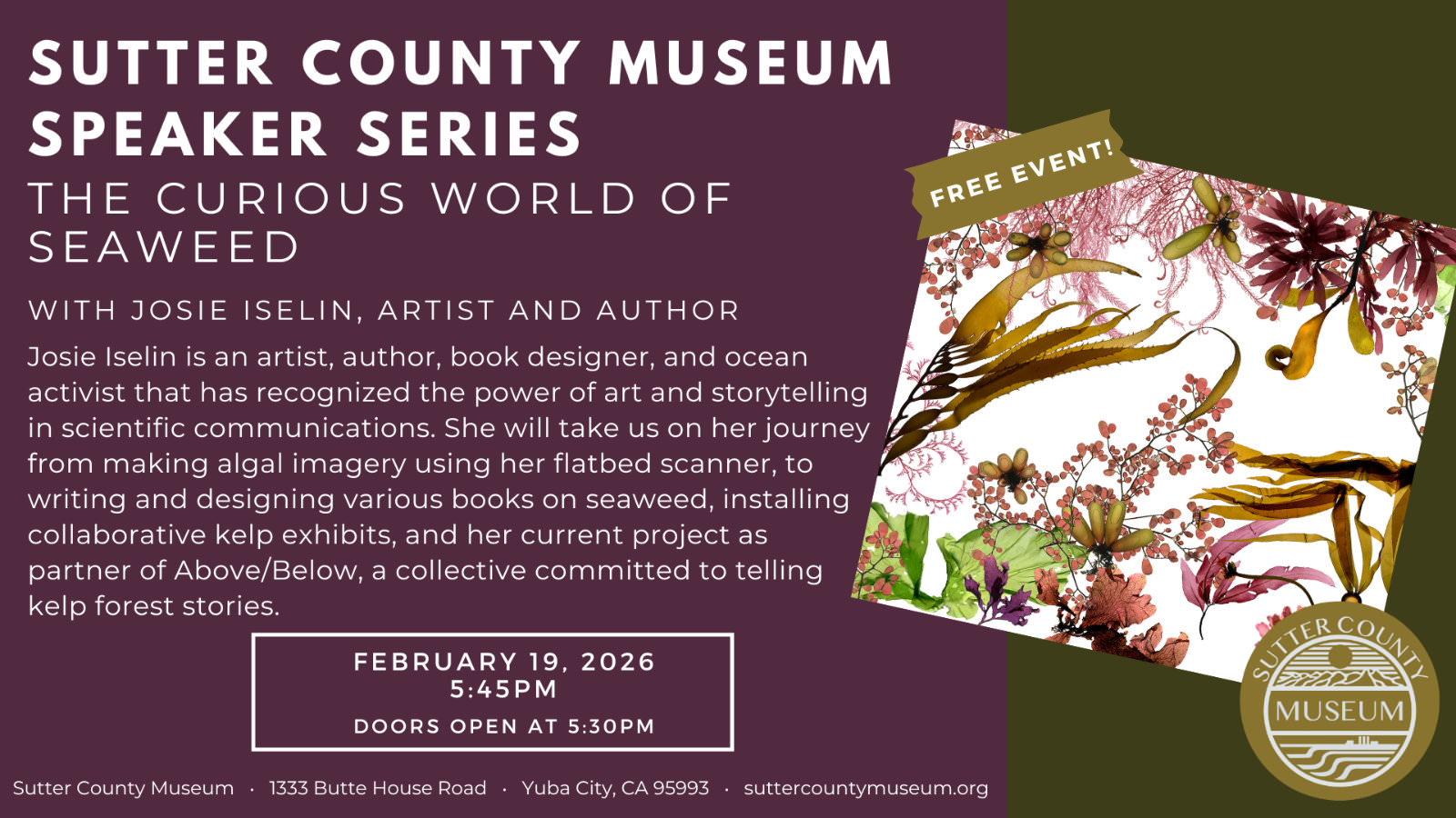 Join us at this FREE reception to celebrate The Curious World of Seaweed exhibit at the Sutter County Museum. Light refreshments will be served. This temporary exhibit will be on display through February 21st.