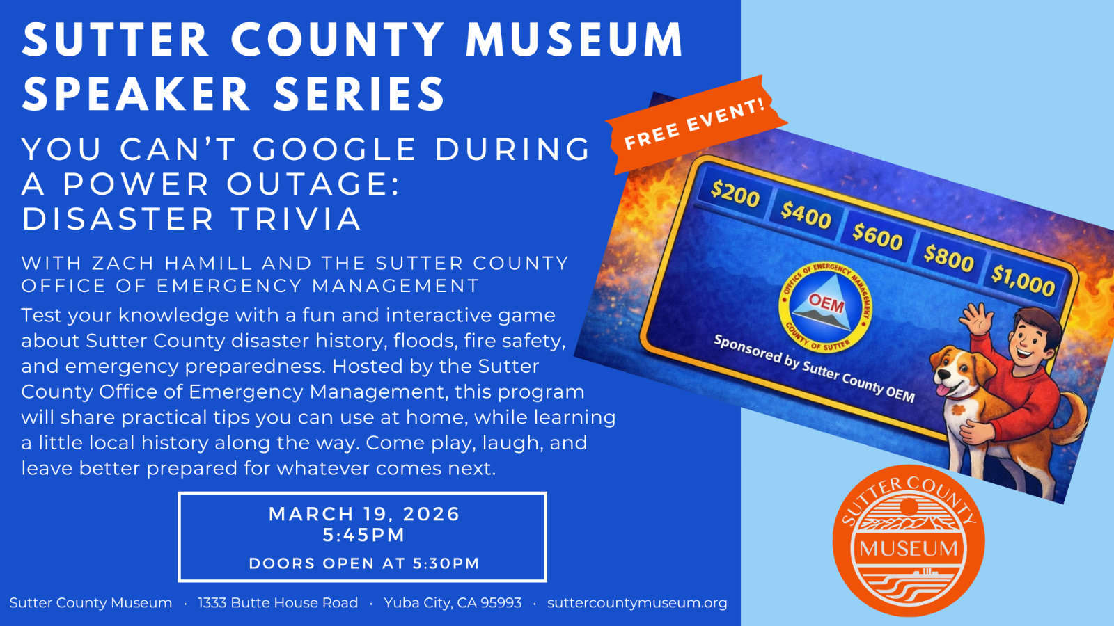 Test your knowledge with a fun and interactive game about Sutter County disaster history, floods, fire safety, and emergency preparedness. Hosted by the Sutter County Office of Emergency Management, this program will share practical tips you can use at home, while learning a little local history along the way. Come play, laugh, and leave better prepared for whatever comes next.